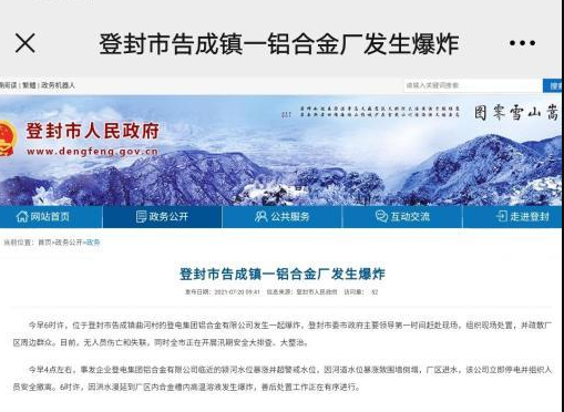 此外,有網友爆料,河南登封一工廠發生爆炸。有消息稱,7月20日4點左右,事發企業登電集團鋁合金有限公司臨近的潁河水位暴漲并超警戒水位,因河道水位暴漲致圍墻倒塌,廠區進水。6時許,洪水漫延到廠區內合金槽內高溫溶液,引發爆炸。