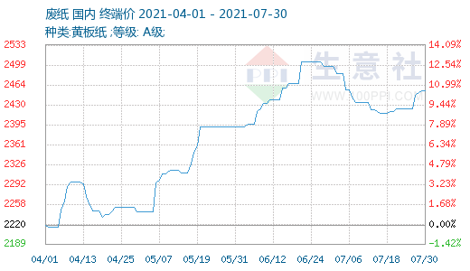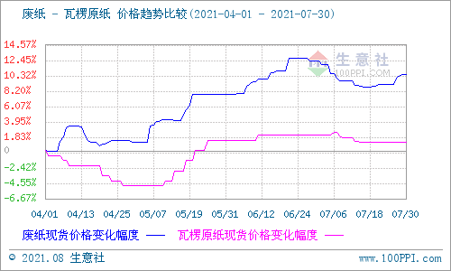 據生意社數據監測:2021年7月廢紙價格整體仍處于下行區間,臨近月末之時價格才稍有上行。截止7月30日廢黃板紙A級收購價格均價為2455元/噸,與月初(7月1日市場收購均價2496.43元/噸)相比均價下調41.43元/噸,下降了1.66%。瓦楞紙價格也隨廢紙價格的下調而調整,月中開始歸于穩定。截止7月30日140g瓦楞原紙參考出廠價均價在3615元/噸(含稅),與月初(7月1日出廠價均價3650元/噸)相比均價下調35元/噸,下降了0.96%。