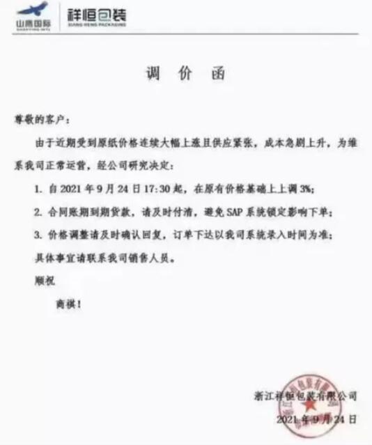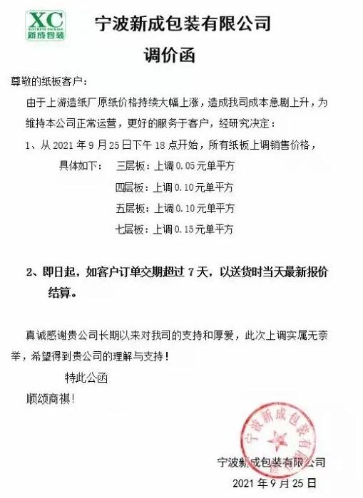 9月25日,寧波市大批紙板廠繼續跟進。慈溪福山、寧波春輝、文康包裝、新成包裝、和熙包裝…短短一個多小時內數家紙板廠發布漲價函,預計更多地區、更多工廠的漲價函也將在這兩天陸續發布。這場始于限電停機的漲價潮洶涌來臨!