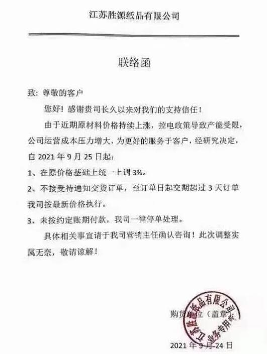 在“能耗雙控”的背景下,對造紙行業、包裝行業的影響不斷擴大,受到成本上漲與停機的影響,玖龍、山鷹及其它紙廠紛紛發布漲價函,國廢、原紙、紙板全面大面積上漲! 玖龍多個基地同時宣布今天原紙最高上調150元!其中東莞玖龍所有牛卡芯紙人民幣港幣漲100元,包括白面?ㄍ坎寂?ā>笼埮瓢装寮垺⒑}埮瓢装寮、地龍牌白板紙人民幣港幣漲100元,江龍牌白板紙漲150元。 沈陽基地:全系列牛皮紙、瓦楞紙在目前價格基礎上上調100元/噸。 江蘇太倉基地:全系列牛皮紙、瓦楞紙在目前價格基礎上上調100元/噸。 天津/河北基地:全系列牛皮紙、瓦楞紙在目前價格基礎上上調100元/噸。 重慶基地:全系列牛皮紙、瓦楞紙在目前價格基礎上上調100元/噸。 泉州玖龍紙業:?、再生紙取消優惠上調50-100元/噸,瓦楞紙上調紙價100元/噸。 另一家紙業巨頭山鷹紙業宣布,從9月25日開始,所有原紙上漲50-200/噸。從10月8日開始,所有原紙再上調200元/噸。 山東德派克紙業有限公司:近期因煤炭漲價、限電減產等造成公司經營成本壓力大,公司決定自2021年9月24日起,所有紗管紙銷售價在原基礎上統一上漲100元/噸。 秦皇島金茂源紙業有限公司:由于近期原材料不斷上漲,造成生產成本大幅增加,即日起我公司紗管紙銷售價格在原有基礎上上漲100元/噸。 中冶美利云產業投資股份有限公司:受國家節能減排政策及環保政策的影響,自9月26日起,將我司旗下所有彩色紙銷售價格在當前執行價格的基礎上上調300元/噸。 廣東理文造紙:?埐糠旨埛N價格上調50元/噸 聯盛紙業(龍海):除優質?ㄍ,其它?埲∠麅灮荩险{紙價100元/噸,聯盛紙業(龍海)高強瓦楞紙上調紙價100元/噸 東莞金洲紙業:Q紙上調50,瓦楞紙上調紙價50元/噸 東莞銀洲紙業:箱板紙上調50元/噸 四川力天紙業:瓦楞紙價格上漲50元/噸 湖北金鳳凰紙業:高強瓦楞紙上調50元/噸 浙江華川紙業:高強瓦楞紙上調50元/噸 廣東中山永發紙業:70g及以下高強瓦楞紙上調100元/噸 浙江義烏義南紙業:高強瓦楞紙上調50元/噸 河南雅都紙業:瓦楞紙價格上調50元/噸 漳州盈晟紙業:高強瓦楞紙上調50元/噸 漳州友利達紙業:瓦楞紙上調100元/噸 江門市橋裕紙業:瓦楞紙上調50元/噸 四川成都迅源紙業:瓦楞紙上調50元/噸 成都迅源紙業:箱板紙上調50元/噸 山東豐源中科:瓦楞紙上調100元/噸 河南亨利紙業:高強瓦楞紙取消優惠 吉林長白山琦祥紙業:瓦楞紙上調50元/噸 原料漲價 中下游企業無奈跟漲 騰然而起的原料成本讓9月以來貼近成本線維持生產的紙板、紙箱廠大呼受不住,“保本生產”轉眼變成虧本生產。在越來越多的原紙漲價函包圍之下,紙板廠也選擇了跟進漲價。9月24日,浙江祥恒包裝有限公司、浙江博萊特紙容器有限公司發布漲價函,紙板價格上調3%。