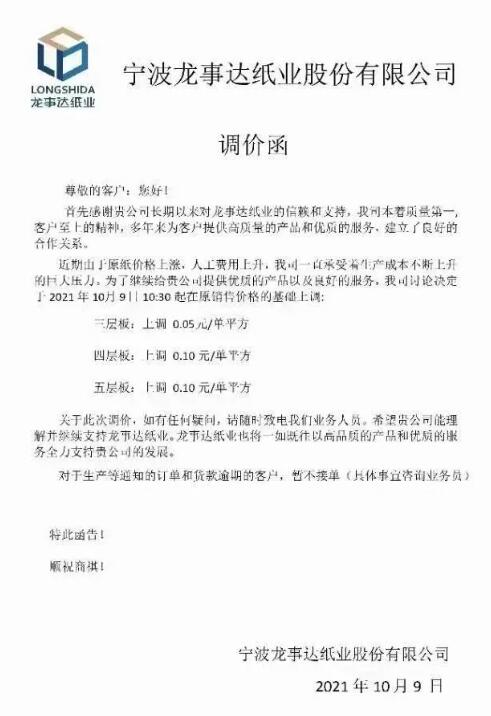 和前3輪漲價不一樣的是,這一次漲價函在上午就被早早發出,新價格最早在今天8點即執行。此外,根據紙箱廠收到的消息,受限電停產影響,該地區紙板廠被執行“開四停三”政策,接下來可能面臨漲價也拿不到貨的情況。