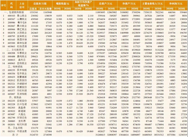 1.2 包裝類產品核心支撐作用明顯,是行業最重要的盈利來源 近年來我國電商業務飛速增長,快遞業蓬勃發展,加之限塑令的實施,對造紙包裝產業將是一個難得的發展機遇,紙質包裝未來一段時間內將成為塑料的重要替代品,未來幾年包裝紙板類龍頭企業將取得更大的競爭優勢。 本年度以高強瓦楞原紙、牛皮卡紙、白卡紙為主的企業獲利能力最大,圍繞現代運輸包裝用的高檔瓦楞紙箱、紙板及緩沖包裝材料為主的綠色環保產品,不僅具有保護商品、便于倉儲及裝卸運輸的功能,還能起到美化商品、宣傳商品的作用,同時能夠減少損耗及包裝空間。以其優越的使用性能和良好的加工性能逐漸取代了傳統的木箱等運輸包裝容器,成為現代包裝運輸的主要載體,發展空間較大。特別是瓦楞紙箱隨著現代商業及物流產業的快速發展,無論運輸包裝還是銷售包裝,已成為現代商業和貿易中使用最為廣泛的包裝容器之一。疫情防控、環保限塑、互聯物流催生了對醫用防控紙基材料、一次性食品包裝和物流標簽用紙等系列產品的需求大幅上升。 以食品與醫療包裝材料系列、商務交流及出版印刷材料系列、煙草行業配套系列、家居裝飾材料系列、電氣及工業用紙系列等紙基功能材料為主的特種紙產品盈利能力顯著提升;生活用紙屬于快消品,直接面對消費者,品牌效益逐步凸顯,也作為主要防疫物資之一,盈利能力保持較高水平。得益于國家對精神文明、文化教育和輿論宣傳的高度重視,以雙膠紙、復印紙、銅版紙為主的文化紙類產品市場需求良好,盈利能力獲得較好提升。 1.3 全產業鏈安全意識日益增強,致力于共同構建產業互聯網和諧生態圈 各公司以市場為驅動、以顧客需求為導向,積極在行業內采用“產業鏈一體化”發展方式和“包裝一體化”的服務模式。造紙行業正積極向全產業鏈模式轉型,“林漿紙一體化”模式已經逐步成為造紙行業產業升級、節約能耗、整合產業的主要手段,也為造紙行業應對原料漲價、尋找發展平衡點提供了新出路。紙制品企業作為包裝一體化服務供應商,兼具生產商、設計服務提供商、采購服務商與物流服務商的特點,從降低成本、提高效率、增加價值三方面為客戶提供包裝產品與服務。如近年來山鷹紙業積極從全球視野進行產業鏈布局,現已擁有廢紙原料采購、包裝紙和紙板生產、紙箱生產加工的完整產業鏈,企業規模迅速壯大,獲得業界的高度關注。造紙行業作為典型的中游制造業,呈現“長鏈條、重資產、需求多樣”的行業特征,誰搶占原材料制高點,誰就掌握市場主動權。已具備林漿紙一體化生產模式的晨鳴、太陽、博匯等大型企業有望持續具備更低的成本優勢和更強的綜合競爭力。 許多公司致力于為產業鏈“搭建一個生態圈”,將以更加開放的理念,共同構建產業互聯網和諧生態圈,與合作伙伴共創共享共贏。 1.4 強化合法合規運行,切實履行社會責任 2020 年,造紙板塊31 家上市公司積極提升企業內部治理和合規管理,年度報告審計結果均是無保留意見的審計報告,這是歷史首次。2020 年度有24 家企業發布擬進行利潤分配的預案,比2019 年的19 家多5 家,數量之多也是歷史首次,切實履行了上市公司對股東和投資者的投資回報承諾。 各公司堅持倡導“循環經濟、綠色制造”的發展理念,均嚴格遵守國家及地方政府環保法律、法規和相關規定,在年報里詳細披露企業環保治理達標排放情況和具體治理措施,踐行生態綠色發展的可持續目標計劃和行動。 許多公司特別是頭部企業和國資背景的公司認真貫徹《國務院關于打贏脫貧攻堅戰三年行動的指導意見》文件精神,積極按照《中國證監會關于發揮資本市場作用服務國家脫貧攻堅戰略的意見》部署公司精準扶貧相關工作。以實際行動響應國家脫貧攻堅戰略的總體要求,為國家按期實現全民脫貧和實現小康社會的目標做出重要貢獻。 在應對新冠疫情過程中,許多公司迅速行動,承擔社會責任,積極捐款和捐贈防疫物資,并參與防控活動,為打贏這場疫情防控的“人民戰爭”積極貢獻力量。 1.5 創新驅動漸強,有力推動高質量發展 持續提升創新驅動和技術進步擴散能力,已成為造紙工業可持續發展的重要抓手。生態化競爭方興未艾,智慧經營時代已經到來。 隨著區塊鏈、人工智能、物聯網、大數據、5G 等新興技術的發展,今后在生產方式上一定會迎來一場大變革,主要就是在人工智能方面。各公司研發工作的重心放在產品結構調整和原材料結構調整等方面,研發投入集中在全要素成本節約上,圍繞成本領先戰略展開。推進一批智能化、自動化項目,加快智慧工廠建設步伐。加強信息化管理建設,廣泛應用OA 辦公系統、物資需求計劃請購系統等智能化管理系統,為企業職能管理、投資決策提供精準、快速服務,在提高風險管控方面取得顯著成績。 仙鶴紙業大力推進的“數字化仙鶴”工業 4.0 建設,目前已有實質性進展,基礎管理向網絡化、智能化、協同化進軍,提升了公司的智能制造水平。山鷹紙業全力推進山鷹數字化建設,打造的云印產業互聯網平臺秉承“數字創造價值,科技賦能紙業”的理念,通過數字化產品的“單廠提效,多廠協作”深度服務合作企業,構建行業聯盟生態。公司在華中山鷹率先落地工業 4.0,全力打造現代化智慧工廠,已在東莞、六安、長沙及成都基地實現智慧工廠,