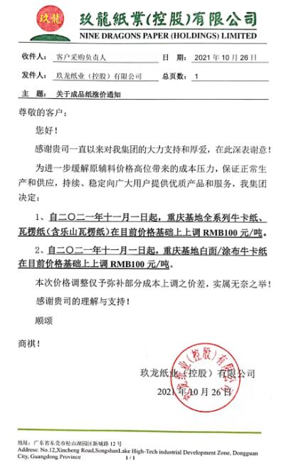 重慶玖龍:11月1日起,全系列牛卡紙、瓦楞紙(含樂山瓦楞紙)及白面/涂布牛卡紙漲價100元/噸。