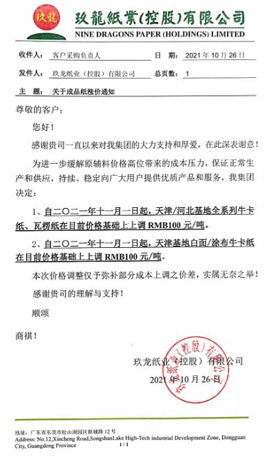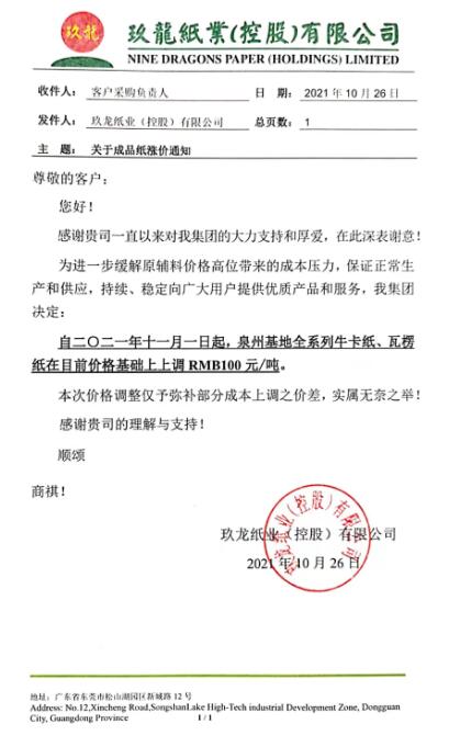 天津/河北玖龍:11月1日起,全系列牛卡紙、瓦楞紙、白面/涂布牛卡紙漲價100元/噸。