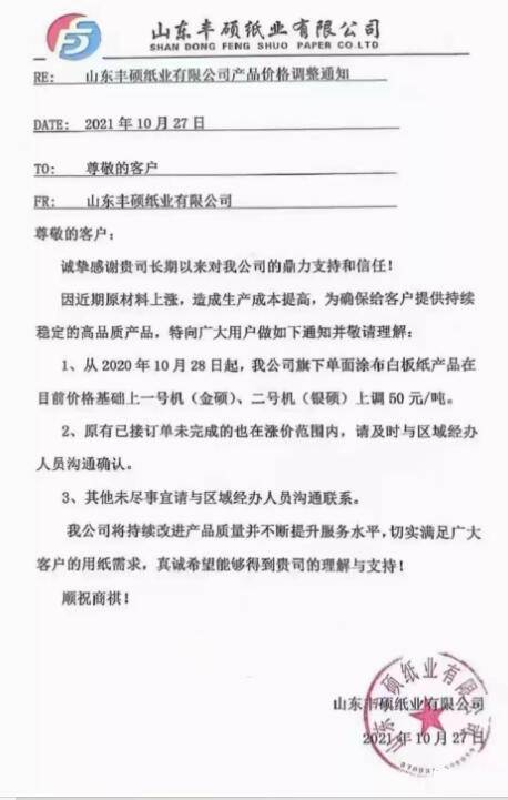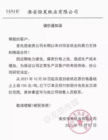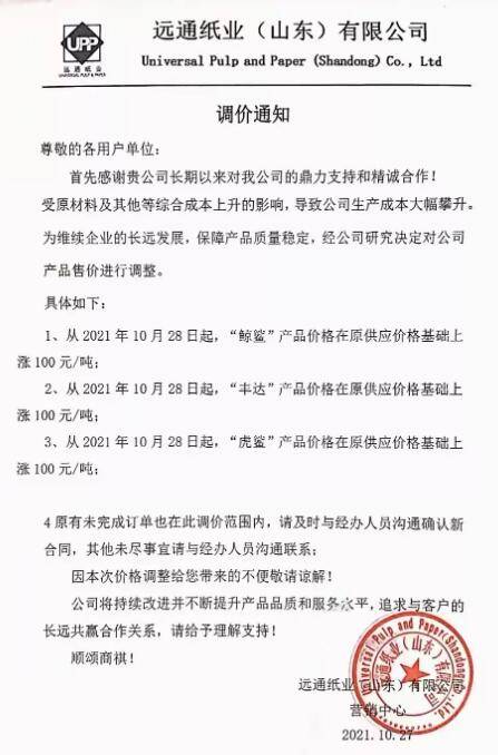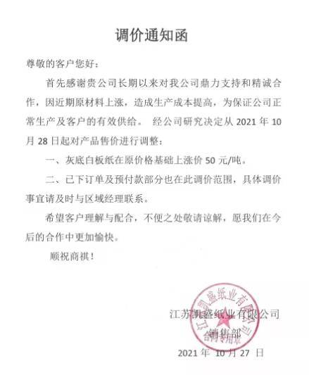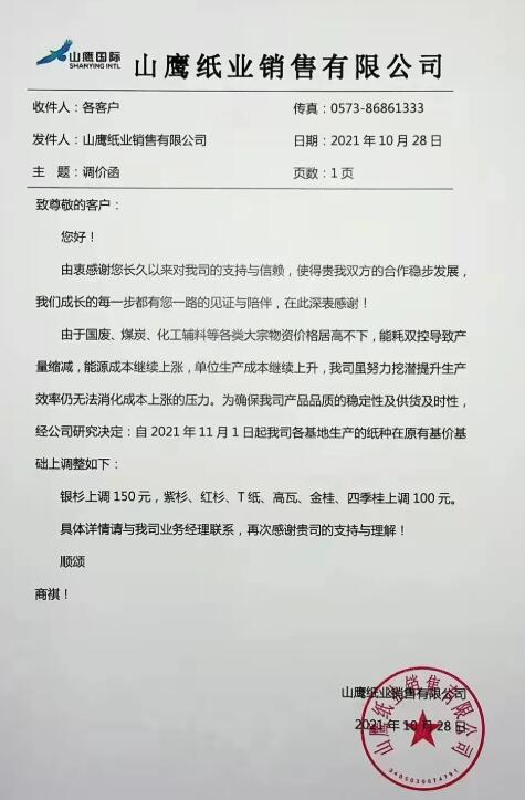 由于國廢、煤炭、化工輔料等各類大宗物資價格居高不下,能耗雙控導致產量縮減,能源成本繼續上張,單位生產成本繼續上升,公司雖努力挖潛提升生產效率仍無法消化成本上漲的壓力。 為確保產品品質的穩定性及供貨及時性,經公司研究決定:自2021年11月1日起,銀杉上調150元/噸,紫杉、紅杉、T紙、高瓦、金桂、四季桂上調100元/噸。 山鷹是國內包裝紙巨頭,年產能坐三望二,其T紙、高瓦產品不必多言,銀杉、紅杉、紫衫均屬于牛皮箱板紙系列,金桂、四季桂分別屬于白面涂布牛卡紙和白面牛卡紙,幾乎涵蓋紙板生產企業的各類原紙材料。 從上月底至今,山鷹國際與玖龍紙業連續發起了五六輪漲價,且各自發布漲價函的時間僅相差一兩天,不僅步伐一致,漲幅亦十分相近。本次兩家巨頭均提前宣布11月1日再漲100-150元/噸,將進一步提升原紙價位水平,抬高市場上漲預期。 事實上,目前國內就已有多家中小紙廠宣布漲價。比如,江蘇凱盛紙業有限公司、遠通紙業(山東)有限公司、淮安恒發紙業有限公司、山東豐碩紙業有限公司等紙廠就宣布10月28日上調,漲幅為50-100元/噸。 江蘇凱盛紙業有限公司