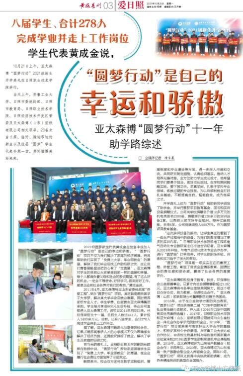 10月25日《黃海晨刊》整版報道 八屆學生、合計278人 完成學業(yè)并走上工作崗位 學生代表黃成金說 “圓夢行動”是自己的幸運和驕傲 ——亞太森博“圓夢行動”十一年助學路綜述 10月21日上午,亞太森博“圓夢行動”2021級新生開學典禮在日照職業(yè)技術(shù)學院舉行。 當天上午,齊魯工業(yè)大學、日照市委統(tǒng)戰(zhàn)部、日照市教育局、日照職業(yè)技術(shù)學院、日照經(jīng)濟技術(shù)開發(fā)區(qū)管委及亞太森博(山東)漿紙有限公司相關(guān)領(lǐng)導,23名來自日照、臨沂、濰坊等地的新生以及往屆“圓夢”學生代表齊聚一堂,共同憧憬美好未來。