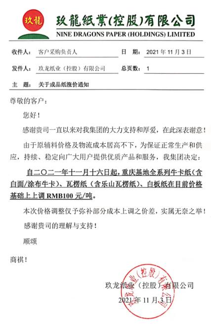 11月1日,玖龍紙業各基地紙種全線上漲,落實此前宣布的100-150元/噸的漲幅。時隔兩日后,玖龍紙業又發出新的漲價函,旗下各大基地將從11月16日起100元/噸。這將是玖龍紙業在11月份的第二輪漲價,也是自9月底以來的第七輪上調。 東莞玖龍 自11月16日起,東莞基地全系列牛卡紙(含白面/涂布牛卡)、瓦楞紙、白板紙、文化紙在目前價格基礎上上調漲價100元/噸。