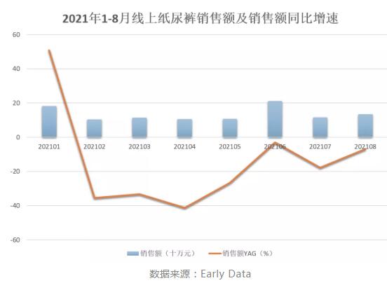 今年以來我國(guó)紙尿褲市場(chǎng)規(guī)模有所下降,而這一態(tài)勢(shì)在線上尤為顯著。無論多惡劣的行業(yè)環(huán)境,具有遠(yuǎn)大格局且勇于探索品牌依舊能穩(wěn)定增長(zhǎng)。縱觀2021,紙尿褲行業(yè)有哪些增長(zhǎng)之道? 01、紙尿褲線上銷售額下滑15.3% Early Data數(shù)據(jù)顯示,綜合阿里、京東兩大電商平臺(tái),2021年1-8月線上紙尿褲總銷售額同比下滑15.3%;總銷量1.074億件,同比下滑13.3%,紙尿褲線上市場(chǎng)規(guī)模萎縮。 從1-8月銷售額增速走勢(shì)看,紙尿褲線上銷售額增速在2021年4月觸底反彈,并于6月(618大促)登上頂峰。