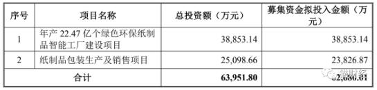 從招股書來看,公司計劃通過IPO募集約6.27億元資金,其中“年產(chǎn)22.47億個綠色環(huán)保紙制品智能工廠建設(shè)項目”、“紙制品包裝生產(chǎn)及銷售項目”分別占用募資3.89億元和2.38億元。