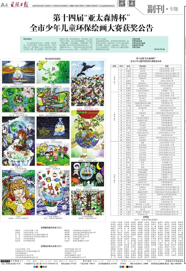 《日照日報》 整版公告 12月19日上午 第十四屆“亞太森博杯” 全市少年兒童環保繪畫大賽頒獎典禮 在亞太森博(山東)漿紙有限公司舉行