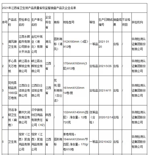 據(jù)江西省市場監(jiān)督管理局網(wǎng)站2021年12月31日消息,2021年,江西省市場監(jiān)督管理局對全省衛(wèi)生紙產(chǎn)品質(zhì)量進行了監(jiān)督抽查。本次抽查了10批次衛(wèi)生紙產(chǎn)品,經(jīng)檢驗,全部合格。