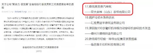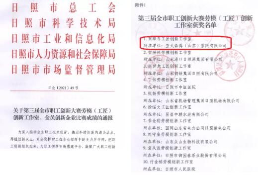 日前,公司在日照市“雙十佳”創建活動中榮獲“日照市十佳職工信賴的職工之家”;在第三屆全市職工創新大賽中,公司“宋琛年工匠創新工作室”榮獲勞模(工匠)創新工作室;在全省輕紡行業優秀職工代表提案活動中,公司漿生產部王立永的《降低蒸發蒸汽單耗》提案榮獲“聚合力 促發展”全省輕紡行業優秀職工代表提案。