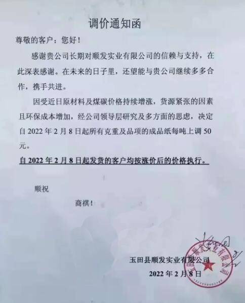 緊接著,廣東、河北、江蘇等地傳來新的紙價上漲消息。2月8日,玉田縣順發實業發布漲價函,宣布所有克重及品項的成品紙上調50元/噸;2月10日,東莞建暉紙業各種等級環保牛皮箱板紙銷售價格在原價格的基礎上上漲¥100元/噸。 玉田縣順發實業有限公司: