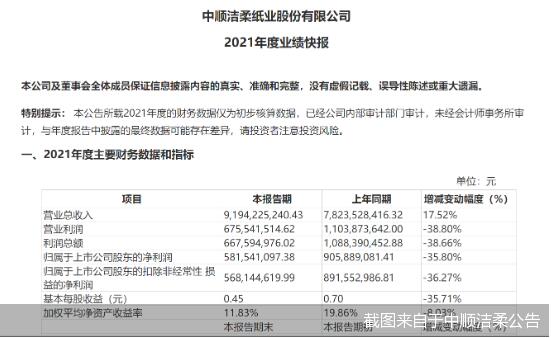 凈利下滑超三成,高管頻繁離職,素有“A股紙茅”的中順潔柔過去一年的發展似乎不太順利。2月28日,中順潔柔發布業績快報,凈利潤下滑超三成,這是自2015年以來,中順潔柔凈利潤首次出現負增長。 凈利潤下降三成 原料價格上漲成誘因 中順潔柔業績快報顯示,2021年度,其營業收入為91.94億元,較去年同期增長17.52%,歸屬于上市公司股東的凈利潤為5.82億元,較去年同期下降35.8%。