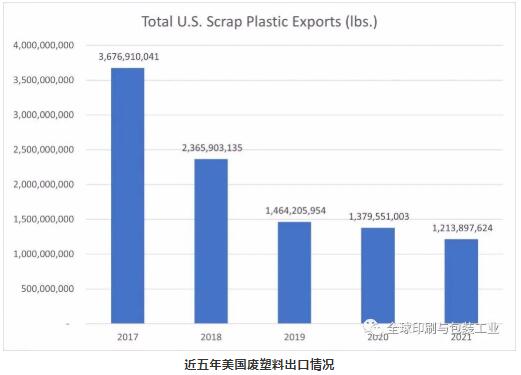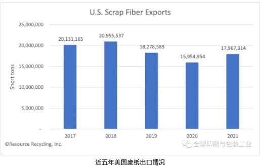 這兩個因素最終推高了箱板紙價格。在圖3中,我們可以看到瓦楞原紙和掛面紙板的貿(mào)易衍生國內(nèi)價格走勢。在2021年期間,這兩種產(chǎn)品的價格穩(wěn)步上漲,箱板紙價格達(dá)到910美元/噸,瓦楞紙價格達(dá)到791美元/噸,與2020年第四季度相比分別上漲約26%和32%。 另外,根據(jù)美國最新公布的數(shù)據(jù)顯示,2021年,美國對中國的廢紙出口繼續(xù)大幅下降,但世界其他地區(qū)的進(jìn)口量彌補(bǔ)了這一差距。而美國廢塑料的出口量則持續(xù)了多年的下降趨勢。數(shù)據(jù)顯示,2021年美國公司出口了1797萬噸廢紙(包括紙張和紙板),高于上年的1595萬噸,增幅為13%。美國在2021年出口了12.1億磅廢塑料,低于前一年的13.8億磅,或減少了約12%。