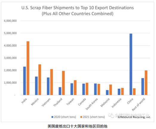 去年在廢紙出口方面,進(jìn)口美國廢紙的10大國家和地區(qū)有較大的變動,更多的廢紙出口到了泰國(增長203%)、馬來西亞(增長109%)、印度(增長89%)、墨西哥(增 66%)、越南(增長48%)、中國臺灣(增長26%)、印度尼西亞(增長11 %)和加拿大(增長7%)。所有其他國家和地區(qū)加起來的廢紙進(jìn)口增加了45%。 這些國家和地區(qū)的進(jìn)口都在很大程度上彌補(bǔ)了對中國市場出貨量的暴跌,后者減少了約89%。具體而言,中國在2021年進(jìn)口了54.8萬噸美國廢紙,低于前一年的497萬噸。最后,美國對韓國的廢紙出貨量下降了3%。