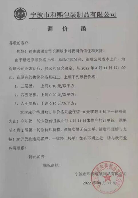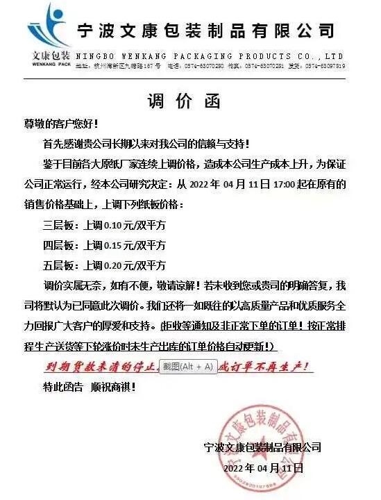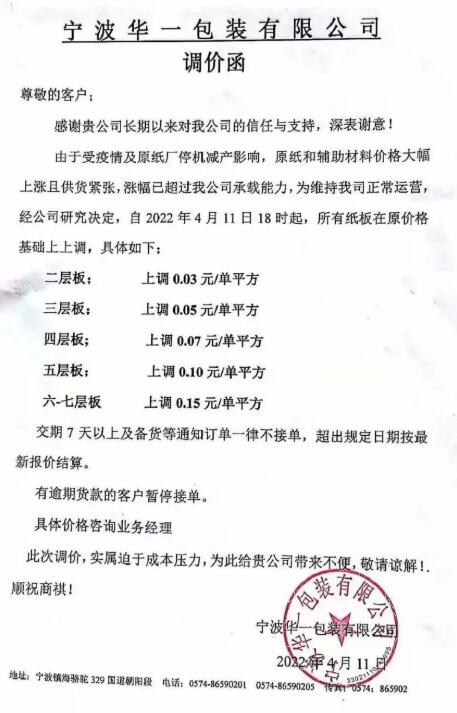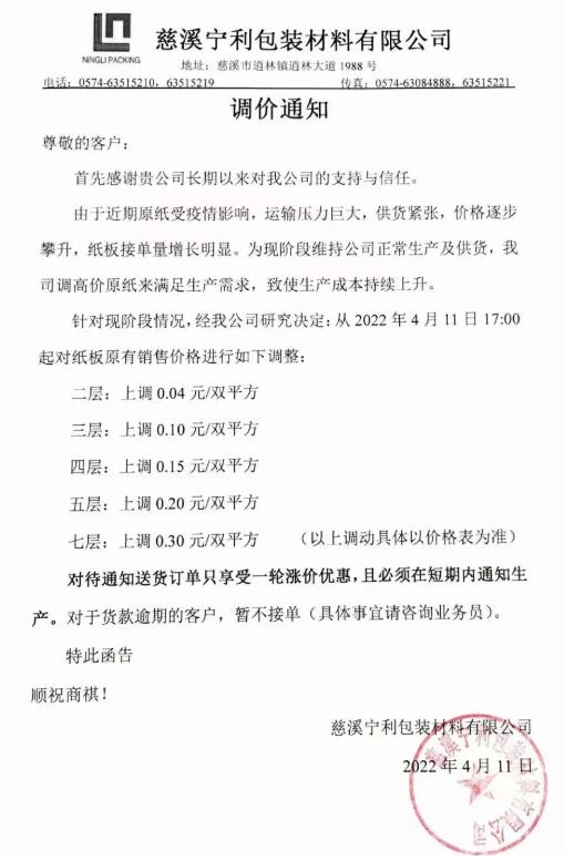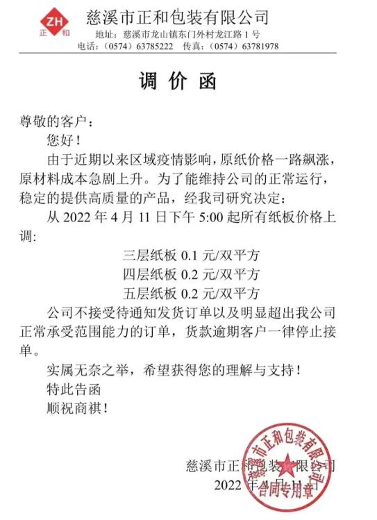 受到疫情的影響,從3月開(kāi)始,多地快遞物流出現(xiàn)了階段性延緩甚至中斷。現(xiàn)在對(duì)于紙箱行業(yè)人士來(lái)說(shuō),除了擔(dān)心水漲船高的成本,還要憂愁物流能不能送到的難題。有多家紙箱廠反映,平時(shí)2-4天就能到的材料,現(xiàn)在至少要5-7天,極端點(diǎn)的甚至要10幾天。 在交貨壓力下,從3月底開(kāi)始上海及周邊部分紙板、紙箱訂單以高出地區(qū)平均水平的價(jià)格外流,并造成紙板價(jià)格異常上漲。以臨近上海的蘇州某紙板廠為例,其紙板價(jià)格自疫情來(lái)已經(jīng)漲了將近20%。 而隨著受物流受阻及停工影響的地區(qū)增多,從上周起,該工廠也被迫停工,訂單再度往更遠(yuǎn)的周邊地區(qū)流出,帶來(lái)的交貨周期延長(zhǎng)和價(jià)格上漲,讓本就缺料的下游雪上加霜。此外,由于疫情因素,原紙供應(yīng)減少,導(dǎo)致原紙漲價(jià),也在推動(dòng)紙板價(jià)格上漲。下圖為已發(fā)布的漲價(jià)函: 寧波豐宇包裝: