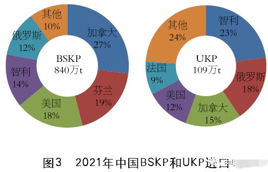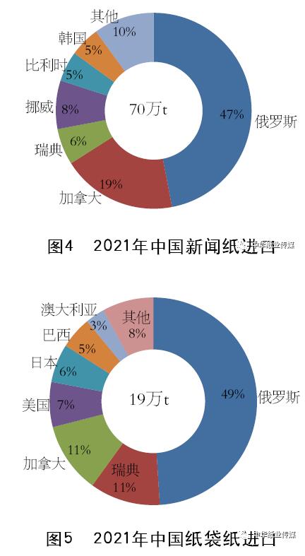 在紙和紙板方面,俄羅斯也是中國新聞紙、紙袋紙和箱板瓦楞紙的主要來源國之一,如圖4、圖5和圖6所示。尤其在新聞紙和紙袋紙,2021年來自俄羅斯的進口量占據中國全部進口的近50%,且中國國內這兩大類紙種對進口的依存度較高,由此可知俄羅斯對中國國內新聞紙和紙袋紙供應有著重要的地位。對箱板瓦楞紙而言,2021年中國進口量610萬t,俄羅斯占總進口量的9%,約55萬t,其中全木漿牛卡紙19萬t,俄羅斯是中國國內牛卡紙的第二大來源地,位于最大的來源地美國(牛卡紙40萬t)之后。