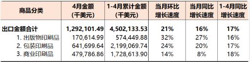 2022年4月,國內印刷品出口12.92億美元(參見表3),環比增長21%、同比增長16%。其中,出版物印刷品出口1.71億美元(環比下增長32%、同比增長27%)、包裝印刷品出口6.42億美元(環比增長24%、同比增長20%)、商業印刷品出口4.80億美元(環比增長14%、同比增長8%)。 表3 2022年4月國內印刷品出口統計