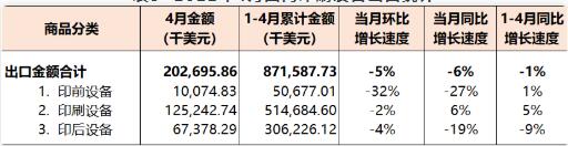 相關設備主要子項進口,膠印機2.35億美元(同比下降22%)、凹版印刷機577.93萬美元(同比下降33%)、柔版印刷機852.31萬美元(同比增長242%)、絲網印刷機1312.52萬美元(同比下降29%)、凸版印刷機4.58萬美元(同比下降98%)、數字印刷機6442.87萬美元(同比下降21%)、印刷輔機和零件2.46億美元(同比下降17%)、書刊裝訂設備1164.87萬美元(同比下降49%)、包裝印后設備1380.39萬美元(同比下降51%)。 2022年1-4月,國內印刷裝備出口8.72億美元(參見表11),比去年同期下降1%。其中,印前設備出口5067.70萬美元(同比增長1%)、印刷設備出口5.15億美元(同比增長5%)、印后設備出口3.06億美元(同比下降9%)。 表11 2022年1-4月國內印刷裝備出口統計