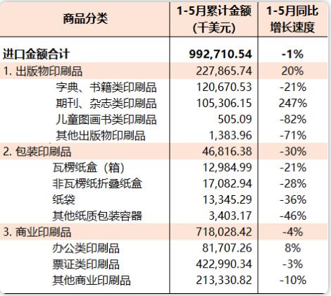 2022年1-5月國內(nèi)印刷器材進出口貿(mào)易順差3.15億美元(同比增長104%)。 本期觀察 2022年1-5月國內(nèi)印刷產(chǎn)業(yè)相關(guān)商品進出口同比增長10%,與上期(1-4月)相比,提升了2個百分點。而拉動其提升的主要動力來自印刷品、印刷裝備、印刷器材三大類商品的出口增長。 本期,國內(nèi)印刷產(chǎn)業(yè)相關(guān)商品進出口貿(mào)易特點如下: 三大類商品進口速度相對萎縮的態(tài)勢未見根本改觀:1-5月份,國內(nèi)印刷產(chǎn)業(yè)相關(guān)商品進口同比下降12%。其中,印刷品進口同比下降1%(較上期上升2個百分點)、印刷裝備同比下降23%(較上期降低2個百分點)、印刷器材同比下降9%(較上期提高2個百分點)。 印刷品、印刷器材出口繼續(xù)大幅增長、印刷裝備出口增長速度由負轉(zhuǎn)正:1-5月份,國內(nèi)印刷品和印刷器材的出口同比增長速度分布為19%和41%。同時,國內(nèi)印刷裝備出口由上期的負增長(-1%)轉(zhuǎn)變?yōu)檎鲩L(2%)。 亞洲、歐洲和北美的市場穩(wěn)固,拉美和非洲市場增長顯著:1-5月份,國內(nèi)印刷品、印刷裝備、印刷器材進出口在亞洲、歐洲和北美洲三大區(qū)域市場的分布相對穩(wěn)定(亞洲43%、歐洲22%、北美洲24%)。與去年同期相比三個市場相關(guān)進出口增長情況為,亞洲2%、歐洲10%、北美洲增長19%。同時,在拉丁美洲和非洲市場,國內(nèi)印刷產(chǎn)業(yè)相關(guān)商品進出口表現(xiàn)亮眼,其增長速度分別達到35%和16%。 與2021年同期相比,2022年1-5月國內(nèi)印刷品、印刷裝備、印刷器材進口和出口增長較快的前五個商品商品類別如下: 進口:期刊及雜志類印刷品(+247%)、PS膠印版材(+125%)、柔版印刷機(+42%)、辦公類印刷品(+8%)、水性噴墨墨水(+1%); 出口:膠印機(+59%)、CTP膠印版材(+54%)、PS膠印版材(+49%)、柔版印刷機(+41%)、紙袋(+34%)。 同期,國內(nèi)印刷品、印刷裝備、印刷器材進口和出口相對萎縮的前五個商品商品類別如下: 進口:凸印機(-98%)、兒童圖畫書類印刷品(-82%)、CTP膠印版材(-78%)、其他出版物印刷品(-71%)、包裝印后設(shè)備(-55%); 出口:其他出版物印刷品(-62%)、票證類印刷品(-58%)、期刊及雜志類印刷品(-39%)、柔印版材(-14%)、書刊裝訂設(shè)備(-13%)。