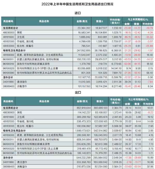 生活用紙 進口 與2021年大幅增長的形勢相反,2022年上半年生活用紙進口量和進口額都出現雙位數下降,進口量1.89萬t,不足2萬t,仍以原紙為主,占總進口量的85.0%。 出口 2022年上半年生活用紙出口形勢良好,一改2021年下半年以來下降的趨勢,出口量、出口額、出口平均價格都實現了雙位數的增長。出口產品仍以加工成品為主,占比77%。原紙和加工成品的出口量和出口額全部實現增長,且加工成品的出口平均價格也出現增長,出口產品的結構繼續向高端化發展。 在經歷了2020年上半年大幅上漲和2021年上半年顯著回落的波動后,2022年上半年生活用紙出口量基本恢復常態,略高于2019年上半年的水平。 吸收性衛生用品 進口 2022年上半年,吸收性衛生用品進口量3.9萬t,比2021年同期下降29.82%,其中占比最大的嬰兒紙尿褲下降更多,達到34.25%;成人紙尿褲進口數量最小,只有219.7t,但同比下降61.15%,下降幅度最大;在吸收性衛生用品中,衛生巾(護墊)及止血塞是唯一實現增長的品類,進口量和進口額分別增長9.58%和9.74%。 進口量的下降,顯示國產吸收性衛生用品已經能夠滿足國內市場需求。同時,數據顯示,成人失禁用品(海關編碼48189000,96190019和96190090)進口平均價格出現較大增長,說明進口的少量產品主要是高端產品的補充。 出口 2022年上半年,吸收性衛生用品出口仍然保持全面增長勢頭,出口量、出口額和出口平均價格都延續了2021年同期的增長趨勢,分別增長12.40%、16.84%和3.95%。其中,嬰兒紙尿褲仍是占比最大的品類,約占34.8%,與2021年同期基本相當。 濕巾 進口 海關統計的濕巾分為清潔濕巾和消毒濕巾兩大類,我國的濕巾進出口貿易以出口為主,進口量不足出口量的1/10。 2022年上半年,濕巾總進口量和總進口額與2021年同期相比都出現兩位數下降,其中占比80%以上的消毒濕巾進口量和進口額分別下降20.46%和15.41%。 出口 與2021年同期相比,濕巾的出口量和出口額分別下降28.69%和17.35%,清潔濕巾和消毒濕巾也都呈現下降的趨勢。但出口平均價格都出現兩位數上漲,說明國產的濕巾產品在國際市場上有一定的話語權。出口產品以清潔濕巾為主,占比達到69%。