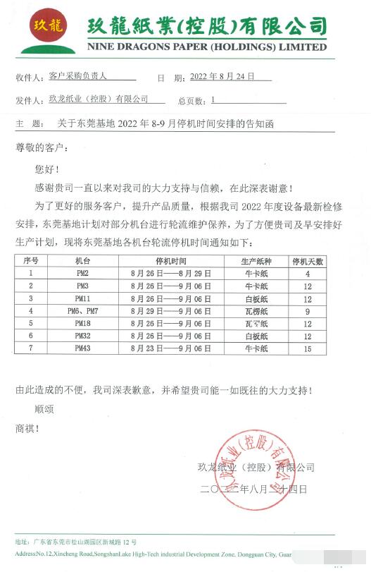 8月24日,玖龍紙業(yè)又一次發(fā)布了《關(guān)于東莞基地2022年8-9月停機(jī)時(shí)間安排的告知函》。 8臺紙機(jī)輪流停產(chǎn)4-15天 這是東莞玖龍紙業(yè)繼7月底以來發(fā)布的第五份停機(jī)檢修通知,8臺紙機(jī)將在8月23日至9月6日期間輪流停產(chǎn)4-15天,具體而言: 在白板紙機(jī)方面,PM11、PM32均在8月26日-9月6日期間停機(jī),時(shí)長均為12天; 在瓦楞紙機(jī)方面,PM6、PM7均從8月29日停至9月6日,時(shí)長為9天;PM18從8月26日起停機(jī),時(shí)長為12天; 在牛卡紙機(jī)方面,PM43從8月23日停至9月6日,時(shí)長半個(gè)月;PM2在8月26日-8月29日期間停機(jī)4天;PM3停機(jī)12天,時(shí)間段為在8月26日-9月6日。