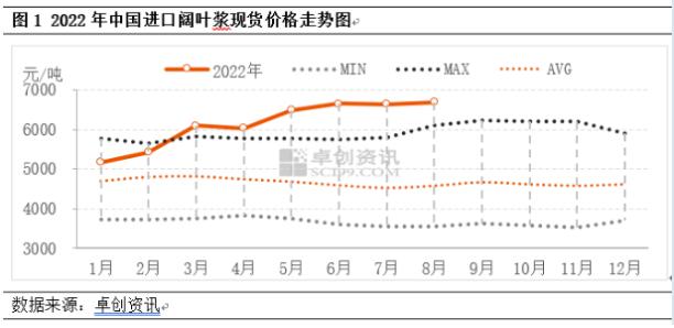導語:2022年以來,進口針葉漿國際突發消息面不斷,闊葉漿突發消息面較少,但中國闊葉漿現貨市場價格卻一路跟隨針葉漿現貨價格上揚后,維持高位僵持態勢,主要與行業集中度較高、新產能投產延期、海運延遲到港、針闊葉漿聯動作用、下游原料需求等有關。卓創資訊分析,四季度漿紙新產能相繼投放,疊加漿紙價差存在,若原紙行業利潤得不到有效改善,或影響闊葉漿價格高位運行。 多方因素支撐,闊葉漿價格高位運行 進口闊葉漿現貨市場價格在1-5月份持續震蕩上揚,6月中下旬價格沖高后窄幅回落,8月份恢復高位運行。據卓創資訊監測數據顯示,2022年1-8月份,進口闊葉漿高價出現在6月6日,低價出現在1月4日,高低價差在1664.77元/噸,幅度在32.69%。2022年1-8月份,進口闊葉漿均價6154元/噸,同比上漲20.27%。根據近年來進口闊葉漿價格波動特點,處于歷史高位。