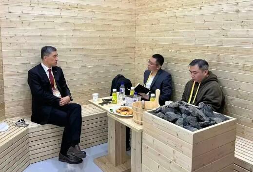 進博“最綠”展臺亮相,被綠葉和北歐云杉環(huán)繞的芬林3B6-02展位充滿森林的自然氣息,北極光造型裝飾仿佛直接把人帶到北歐拉普蘭地區(qū);桑拿房造型的會議室更是1:1還原了芬蘭本地蒸桑拿的場景,讓這個進博展區(qū)內(nèi)唯一的桑拿房躋身進博網(wǎng)紅打卡地;…… 獨具特色的芬蘭文化和低碳元素,吸引來上海人民廣播電臺“話匣子”節(jié)目組進行了兩場現(xiàn)場直播,在首次長達15分鐘的直播中,伴隨著芬林展臺員工的介紹,主持人解鎖了芬蘭國粹桑拿的多個特殊知識點。