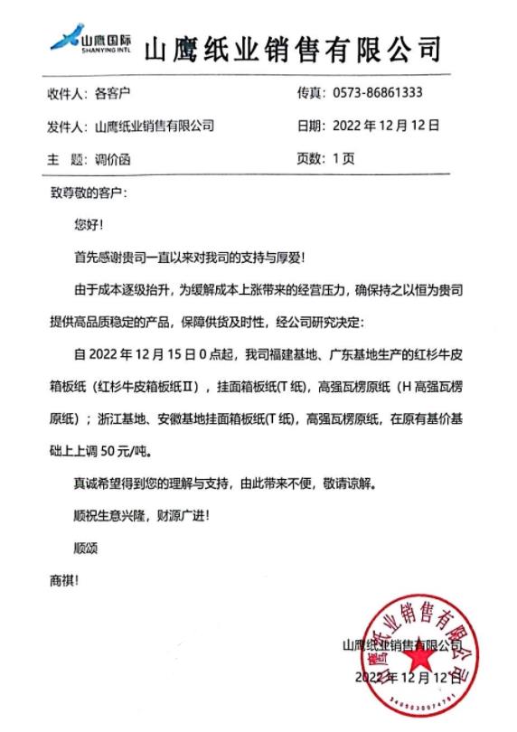 原紙價(jià)格接連調(diào)降、紙企停機(jī)通知陸續(xù)發(fā)布,就在此不利消息充斥紙業(yè)市場(chǎng)時(shí),玖龍紙業(yè)、山鷹國(guó)際這兩大龍頭紙企毅然宣布紙價(jià)上漲!盡管漲幅相對(duì)不大,但也在一定程度上提振了紙業(yè)市場(chǎng),對(duì)帶動(dòng)局部地區(qū)紙價(jià)上調(diào)起到了助推作用。 玖龍、山鷹宣布漲價(jià),漲幅50元/噸 早在上周末,市場(chǎng)就已傳出東莞玖龍紙業(yè)的漲價(jià)消息——12月14日起,再生牛卡、地龍芯紙價(jià)格將上漲50元/噸。而就在不久前,東莞玖龍紙業(yè)還發(fā)布了12月份的停機(jī)檢修計(jì)劃,其12臺(tái)紙機(jī)將在12月4日-26日輪流停機(jī)3-10天。 步入這周后,國(guó)內(nèi)包裝紙行業(yè)另一龍頭紙企山鷹國(guó)際更是發(fā)布漲價(jià)函稱,為緩解成本上漲帶來的經(jīng)營(yíng)壓力,廣東、福建、浙江、安徽四大生產(chǎn)基地將從12月15日起對(duì)部分原紙產(chǎn)品漲價(jià)50元/噸,涉及的主要紙種為: 福建基地、廣東基地:紅杉牛皮箱板紙(紅杉牛皮箱板紙Ⅱ)、掛面箱板紙((T紙)、高強(qiáng)瓦楞原紙(H高強(qiáng)瓦楞原紙)上漲50元/噸; 浙江基地、安徽基地:掛面箱板紙(T紙)、高強(qiáng)瓦楞原紙上漲50元/噸。
