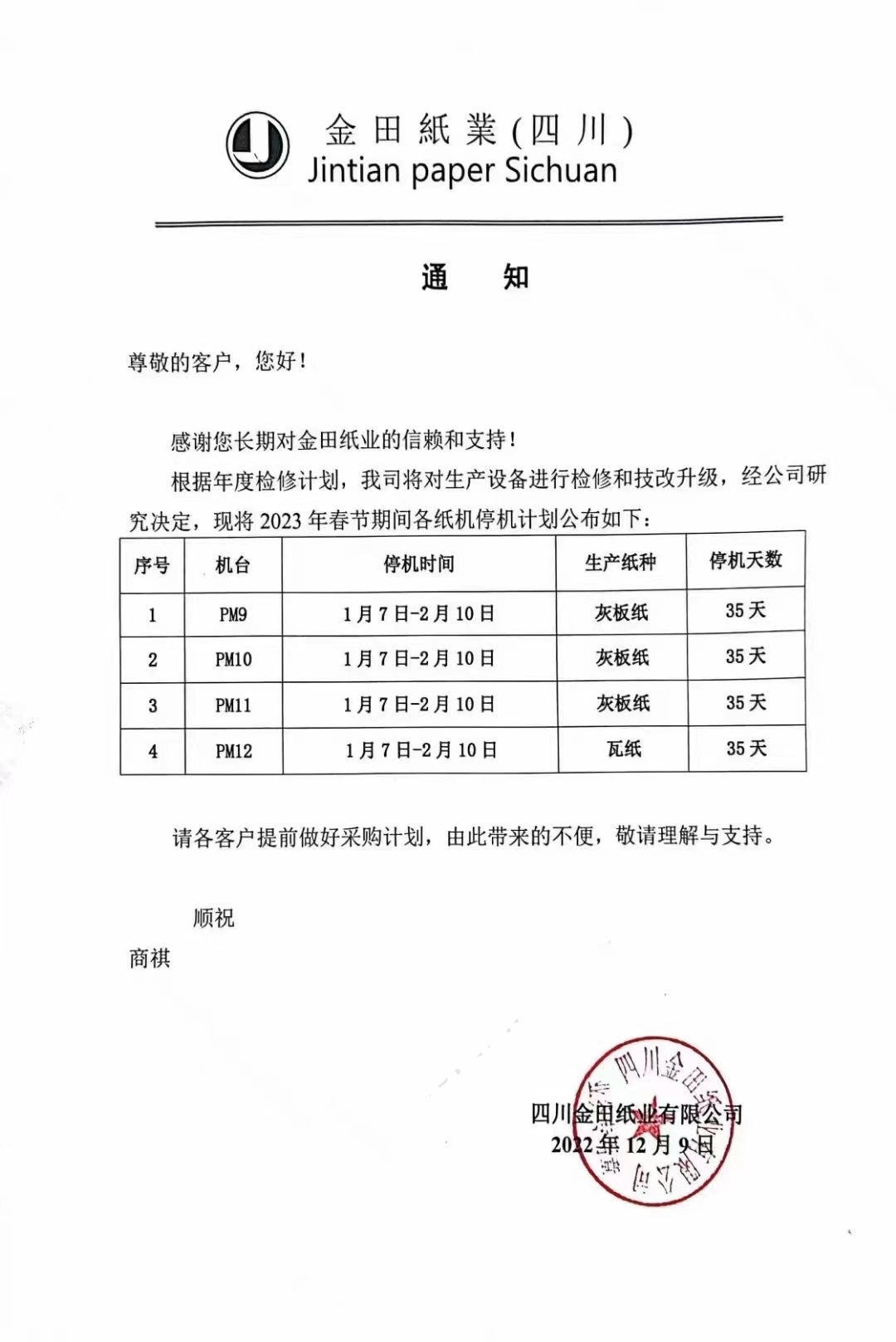 此外,東莞市金田紙業的兄弟企業江蘇金田紙業、四川金田紙業亦在2023年1月份-2月份停機檢修。 江蘇金田紙業: