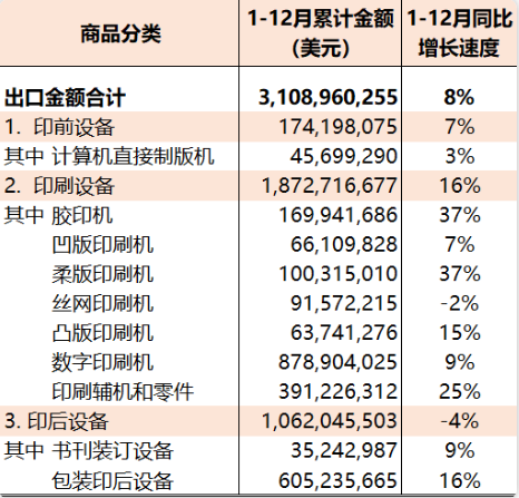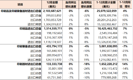 2022年1-12月國內印刷器材出口12.16億美元(參見表7),與去年同期相比增長28%。其中,黑色印刷油墨出口2853.96噸、0.15億美元(同比增長25%);其他印刷油墨出口2.27萬噸、1.50億美元(同比增長31%);水性噴墨墨水出口2.77萬噸、2.43億美元(同比增長34%);PS膠印版材出口4237.34萬平方米、1.40億美元(同比增長24%);CTP膠印版材出口1.71億平方米、6.44億美元(同比增長29%);柔印版材出口53.08萬平方米、0.24億美元(同比下降1%)。 2022年1-12月國內印刷器材進出口貿易順差7.80億美元(同比增長77%)。 本期觀察 1-12月份國內印刷品、印刷裝備、印刷器材三大類商品進出口同比增長4%,較1-11月同比增速(5%)下降1個百分點,也是從8月份開始月度進出口同比增長幅度連續第5個月收窄。 從進出口商品市場看,2022年1-12月國內印刷品、印刷裝備和印刷器材進口和出口的變化特點如下: 亞洲和歐洲市場進口大幅下降、其他市場進口穩定增長:1-12月份,國內印刷產業三大類商品從亞洲進口22.08億美元(同比下降23%)、歐洲進口16.68億美元(同比下降13%)。同期,從北美洲進口9.23億美元(同比增長3%)、拉丁美洲進口0.56億美元(同比增長580%)、大洋洲進口0.23億美元(同比增長15%)。 對全球各區域市場出口同步增長,亞洲市場是支撐出口增長的主力:1-12月份,國內印刷產業三大類商品對全球各區域市場出口分布為,亞洲87.09億美元(同比增長14%)、北美洲47.35億美元(同比增長1%)、歐洲40.09億美元(同比增長6%)、大洋洲9.70億美元(同比增長15%)、拉丁美洲9.51億美元(同比增長29%)、非洲8.28億美元(同比增長22%)。 從進出口商品類別看,2022年1-12月國內印刷品、印刷裝備和印刷器材進出口的變化特點如下: 三大類商品進口負增長態勢延續 ,但下降幅度變化各異:1-12月份,國內印刷品進口同比下降7%、印刷裝備進口同比下降23%、印刷器材同比下降14%。與上期對比,印刷品同比下降幅度擴大3個百分點,印刷裝備同比下降幅度縮小2個百分點、印刷器材同比下降幅度擴大1個百分點。 印刷品、刷器材出口增長幅度趨緩、印刷裝備出口增長平穩:1-12月份,國內印刷品、印刷裝備和印刷器材的出口同比增長速度分別為9%、8%和28%。與上期相比,印刷品出口增速回落1個百分點,印刷裝備出口增速穩定、印刷器材出口增速回落7個百分點。 從進出口商品品種看,2022年1-12月國內印刷品、印刷裝備、印刷器材三大類商品進口和出口增長較快的前五個品種如下: 進口商品:凹版印刷機(+64%)、柔版印刷機(+38%)、票證類印刷品(+12%); 出口商品:膠印機(+37%)、柔版印刷機(+37%)、水性噴墨墨水(+34%)、其他印刷油墨(+31%)、CTP膠印版材(+29%)。 同期,上述三大類商品進口和出口相對萎縮的前五個品種如下: 進口商品:凸印機(-76%)、兒童圖畫書類印刷品(-71%)、CTP膠印版材(-68%)、其他出版物印刷品(-68%)、書刊裝訂設備(-52%); 出口商品:其他出版物印刷品(-78%)、票證類印刷品(-46%)、兒童圖畫書類印刷品(-5%)、期刊及雜志類印刷品(-4%)、絲網印刷機(-2%)。