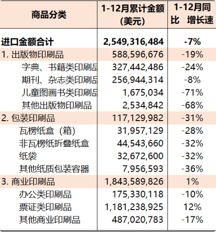 本年度1-12月進出口概況 2022年1-12月國內印刷品、印刷裝備、印刷器材進出口總值為250.80億美元(參見表1),與去年同期相比增長4%。其中,印刷品進出口184.25億美元(同比增長7%)、印刷裝備進出口50.02億美元(同比下降7%),印刷器材進出口16.52億美元(同比增長14%)。同期,國內上述三大類商品進出口貿易順差合計153.23億美元(同比增長21%)。 印刷品 2022年1-12月國內印刷品進口25.49億美元(參見表2),同比下降7%。其中,出版物印刷品進口5.89億美元(同比下降19%)、包裝印刷品進口1.17億美元(同比下降31%)、商業印刷品進口18.44億美元(同比增長1%)。 同期,相關印刷品主要進口品種:字典書籍類印刷品3.27億美元(同比下降24%)、期刊雜志類印刷品2.57億美元(同比下降8%)、瓦楞紙盒(箱)0.32億美元(同比下降28%)、非瓦楞紙折疊紙盒0.45億美元(同比下降32%)、紙袋0.33億美元(同比下降32%)、辦公類印刷品1.75億美元(同比下降10%)、票證類印刷品11.81億美元(同比增長12%)、其他商業印刷品4.87億美元(同比下降17%)。 表2 2022年1-12月國內印刷品進口統計
