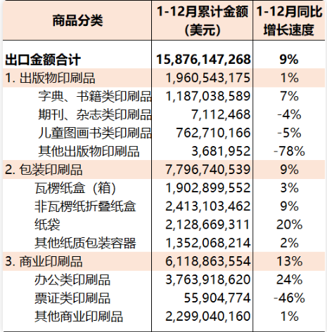 2022年1-12月國內印刷品出口158.76億美元(參見表3),同比增長9%。其中,出版物印刷品出口19.61億美元(同比增長1%)、包裝印刷品出口77.97億美元(同比增長9%)、商業印刷品出口61.19億美元(同比增長13%)。 同期,相關印刷品主要出口品種:字典書籍類印刷品11.87億美元(同比增長7%)、兒童圖畫書類印刷品7.63億美元(同比下降5%)、瓦楞紙盒(箱)19.03億美元(同比增長3%)、非瓦楞紙折疊紙盒24.13億美元(同比增長9%)、紙袋21.29億美元(同比增長20%)、其他紙質包裝容器13.52億美元(同比增長2%)、辦公類印刷品37.64億美元(同比增長24%)、其他商業印刷品22.99億美元(同比增長1%)。 表3 2022年1-12月國內印刷品出口統計