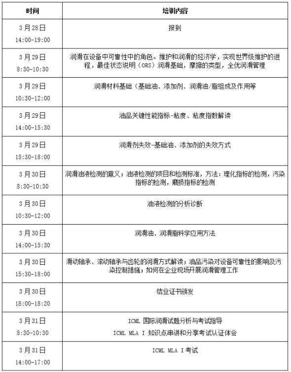 各有關(guān)單位: 油液潤(rùn)滑(包括潤(rùn)滑油、液壓油、潤(rùn)滑脂等)已廣泛應(yīng)用于工廠、車(chē)輛、船舶、航空、軍事等設(shè)備。全球的機(jī)器設(shè)備的機(jī)械零部件失效80%左右來(lái)自各種形式的潤(rùn)滑磨損故障,大型設(shè)備的50%惡性事故與潤(rùn)滑失效有關(guān)。目前,大型設(shè)備的潤(rùn)滑安全或突發(fā)故障等已成為大型工業(yè)企業(yè)安全生產(chǎn)的隱患。 裝備制造業(yè)是“大國(guó)重器”,是國(guó)家經(jīng)濟(jì)社會(huì)運(yùn)行的“基石”。工業(yè)上有句話(huà)說(shuō)是現(xiàn)代裝備是騎在10微米厚的油膜上,工業(yè)的汽輪發(fā)電機(jī)組等設(shè)備也不例外,且設(shè)備價(jià)格昂貴,應(yīng)用和維護(hù)成本高,一旦出現(xiàn)故障,造成生產(chǎn)與維修的經(jīng)濟(jì)損失也比較嚴(yán)重。當(dāng)前設(shè)備潤(rùn)滑管理、健康管理和可靠性管理直接構(gòu)成了企業(yè)的核心競(jìng)爭(zhēng)力和生產(chǎn)運(yùn)營(yíng)成本。 設(shè)備潤(rùn)滑已成為各領(lǐng)域設(shè)備管理的核心內(nèi)容,通過(guò)提高管理,加強(qiáng)油液潤(rùn)滑知識(shí)的積累和學(xué)習(xí),已成為現(xiàn)代企業(yè)降低成本、提高設(shè)備效能、提高經(jīng)濟(jì)效益的重要手段。隨著企業(yè)在油液潤(rùn)滑管理和使用上的需求,“設(shè)備潤(rùn)滑工程師與機(jī)器潤(rùn)滑劑分析師”已成為不可或缺的重要崗位。 ICML(國(guó)際機(jī)器潤(rùn)滑協(xié)會(huì))是一個(gè)中立的非營(yíng)利性組織,其創(chuàng)立的目的旨在推動(dòng)及其潤(rùn)滑技術(shù)的成長(zhǎng)與發(fā)展,在100個(gè)國(guó)家有超過(guò)13700認(rèn)證人員,是國(guó)際上最知名和最具權(quán)威性的專(zhuān)業(yè)潤(rùn)滑知識(shí)培訓(xùn)機(jī)構(gòu)。 本次培訓(xùn)由廣研檢測(cè)聯(lián)合國(guó)際機(jī)器潤(rùn)滑理事會(huì)(ICML)、美國(guó)NORIA潤(rùn)滑管理咨詢(xún)公司、機(jī)械工業(yè)潤(rùn)滑工程技術(shù)研究中心、電力行業(yè)設(shè)備潤(rùn)滑可靠性工程技術(shù)中心、中國(guó)設(shè)備管理協(xié)會(huì)潤(rùn)滑安全工程中心、工業(yè)摩擦潤(rùn)滑技術(shù)國(guó)家地方聯(lián)合工程研究中心、廣州機(jī)械科學(xué)研究院有限公司共同舉辦,定于2023年3月29-31日在長(zhǎng)沙舉辦。 培訓(xùn)結(jié)束后,頒發(fā)機(jī)械工業(yè)潤(rùn)滑工程技術(shù)研究中心認(rèn)可的《職業(yè)培訓(xùn)證書(shū)》。ICML認(rèn)證將由ICML(國(guó)際機(jī)器潤(rùn)滑協(xié)會(huì))統(tǒng)一考評(píng),全程參加并通過(guò)考核評(píng)價(jià)后將頒發(fā)國(guó)際《設(shè)備潤(rùn)滑工程師MLA I》證書(shū)。誠(chéng)邀有關(guān)企業(yè)選派從事潤(rùn)滑領(lǐng)域工作的個(gè)人參加! 一、組織機(jī)構(gòu) 主辦單位: 國(guó)際機(jī)器潤(rùn)滑理事會(huì)(ICML) 美國(guó)NORIA潤(rùn)滑管理咨詢(xún)公司 機(jī)械工業(yè)潤(rùn)滑工程技術(shù)研究中心 電力行業(yè)設(shè)備潤(rùn)滑可靠性工程技術(shù)中心 中國(guó)設(shè)備管理協(xié)會(huì)潤(rùn)滑安全工程技術(shù)中心 工業(yè)摩擦潤(rùn)滑技術(shù)國(guó)家地方聯(lián)合工程研究中心 山東省設(shè)備管理協(xié)會(huì) 天津市設(shè)備管理協(xié)會(huì) 承辦單位: 廣州機(jī)械科學(xué)研究院有限公司 廣研檢測(cè)(廣州)有限公司 好潤(rùn)滑咨詢(xún)有限公司 北京中合油聯(lián)石油化工科技中心 北京智乘科技發(fā)展有限公司 支持媒體: 《潤(rùn)滑與密封》雜志 《汽車(chē)零部件》雜志 中國(guó)潤(rùn)滑油信息網(wǎng) 二、國(guó)際ICML認(rèn)證的價(jià)值 1)認(rèn)證帶給學(xué)習(xí)人員個(gè)人的價(jià)值 a. 獲得國(guó)際機(jī)器潤(rùn)滑協(xié)會(huì)認(rèn)證等于承認(rèn)了您在應(yīng)用機(jī)器潤(rùn)滑和/或油液分析知識(shí)解決及保證潤(rùn)滑設(shè)備可靠性方面的專(zhuān)長(zhǎng)。 b. 潤(rùn)滑和油液分析界,您的雇主、客戶(hù)和同行會(huì)把您獲得的國(guó)際機(jī)器潤(rùn)滑協(xié)會(huì)證書(shū)視為您通過(guò)經(jīng)驗(yàn)獲得的技能和知識(shí)的標(biāo)志。 c. 國(guó)際機(jī)器潤(rùn)滑協(xié)會(huì)的認(rèn)證表明您是一位能夠成功應(yīng)用機(jī)器潤(rùn)滑和油液分析技能為您所在公司或您的客戶(hù)服務(wù)的專(zhuān)業(yè)人員。 d. 工業(yè)界對(duì)您在機(jī)器潤(rùn)滑和油液分析技術(shù)方面所具備的知識(shí)和技能的認(rèn)可。 e. 能夠向同事或者客戶(hù)確認(rèn)自己的國(guó)際機(jī)器潤(rùn)滑協(xié)會(huì)認(rèn)證身份的標(biāo)志和證書(shū)。 2)認(rèn)證帶給企業(yè)的價(jià)值 通過(guò)認(rèn)證,相關(guān)組織可以最大化獲得在油液分析領(lǐng)域的投資回報(bào): a. 確定培訓(xùn)需求和評(píng)估培訓(xùn)效果的標(biāo)準(zhǔn)化方法 b. 雇用,提升和職業(yè)規(guī)劃的可靠基準(zhǔn) c. 員工專(zhuān)長(zhǎng)的認(rèn)可與獎(jiǎng)勵(lì) d. 提高雇員的能力從而確保機(jī)器的可靠性 e. 為提供外包油液分析和潤(rùn)滑服務(wù)提供質(zhì)量保證 3) 認(rèn)證帶給油液分析界的價(jià)值 認(rèn)證將十分需要的證書(shū)帶給蒸蒸日上的油液分析和潤(rùn)滑界,其價(jià)值包括: a. 對(duì)油液