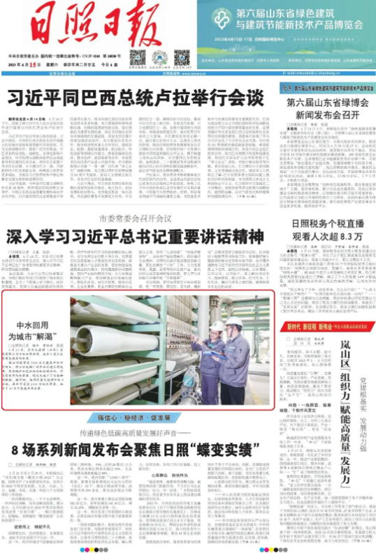 4月13日,在亞太森博(山東)漿紙有限公司中水回用車間,技術人員正在查看處理后的水質。