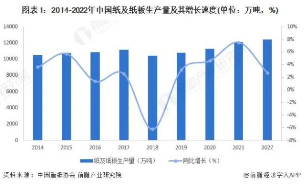 中游供給:中國造紙業產量穩定擴產 根據中國造紙協會的統計數據,2014年以來,我國紙及紙板產量整體呈現震蕩上行趨勢,增速保持在低位運行。2017年我國紙及紙板生產量首次突破11000萬噸;2018年,受行業景氣度下滑影響,整體產量小幅下滑,2019-2022年,產量逐年遞增,至2022年中國紙及紙板生產量達到12425萬噸,同比增長2.6%。
