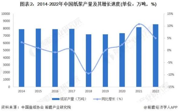 上游供給:紙漿及廢紙供給情況 ——紙漿產量波動較大 根據中國造紙協會的統計數據,2014-2022年,我國紙漿產量呈現波動變化趨勢。由于數字化和無紙化的推進,紙漿下游市場出現較多的替代品,紙漿需求有所下降。2017-2020年紙漿的產量整體上處于下降態勢。2021-2022年,我國紙漿產量有所回升,2022年產量為8587萬噸,同比增長5%。