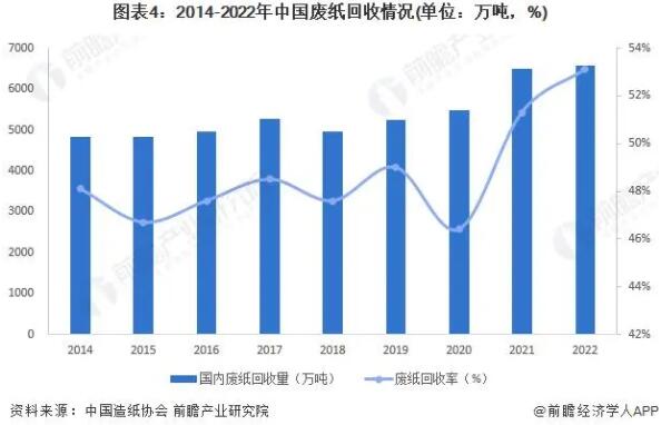——廢紙回收穩定上升 2014-2022年 ,中國廢紙回收量及回收率均呈波動上升趨勢。2014年,中國廢紙回收量為4841萬噸,回收率為48.1%;到2022年,我國廢紙回收量達到6600萬噸左右,回收率增至53%以上。