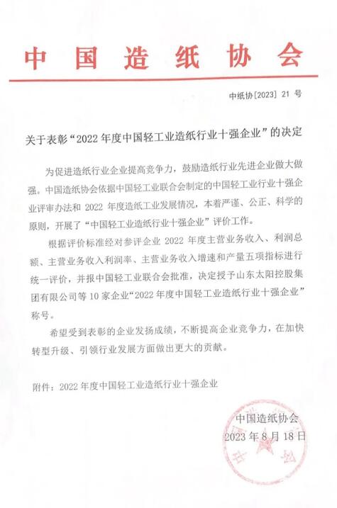 根據(jù)評價標(biāo)準(zhǔn)經(jīng)對參評企業(yè)2022年度主營業(yè)務(wù)收入、利潤總額、主營業(yè)務(wù)收入利潤率、主營業(yè)務(wù)收入增速和產(chǎn)量五項指標(biāo)進行統(tǒng)一評價,并報中國輕工業(yè)聯(lián)合會批準(zhǔn),決定授予山東太陽控股集團有限公司等10家企業(yè)“2022年度中國輕工業(yè)造紙行業(yè)十強企業(yè)”稱號。