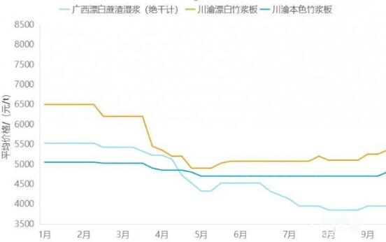 圖2 2023年1—9月川渝竹漿和廣西漂白蔗渣漿平均價格變化趨勢 從各類紙漿價格變化曲線,以及國內市場目前紙漿的供應情況來分析,木漿和非木漿價格變化存在一定的相關性。非木漿價格一定程度上受到木漿價格變化的影響,當木漿價格上漲時,非木漿也呈現不同程度的上漲,但值得注意的是,本色竹漿由于需求減少,2023年以來至今價格一直相對較為穩定。 2023年9月,河北漂白闊葉木漿板(進口)平均價格4825/t、河北漂白針葉木漿板(進口)平均價格5563/t、廣西漂白闊葉木漿板(進口)平均價格4700/t、廣西本地漂白桉木濕漿(絕干計)平均價格約4800/t,較2023年8月均有所上漲。 非木漿中,川渝漂白竹漿平均價格約5400/t,較2023年8月(5100/t)上漲300/t;本色竹漿平均價格約4763/t,較2023年8月(4700/t)略有上漲。廣西漂白蔗渣濕漿(絕干計)平均價格約3950/t,較2023年8月(3850/t)上漲100/t。具體變化情況見表1。 紙漿價格的波動也對生活用紙原紙的價格產生一定影響,原紙價格總體的變化趨勢與紙漿保持一致,但原紙價格的漲幅與紙漿價格漲幅并不完全一致,時間點也不完全同步,主要原因是國內原紙產能相對過剩,市場競爭激烈,原紙價格變化相對紙漿價格變化有一定的滯后。 同時具體影響程度還取決于多種因素,如企業產品定位、新產品開發、產品升級等。