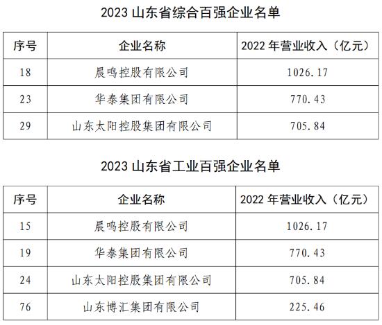 近日,山東省工業(yè)和信息化廳公布了2023山東省綜合百強(qiáng)企業(yè)名單、工業(yè)百強(qiáng)企業(yè)名單。晨鳴控股有限公司、華泰集團(tuán)有限公司和山東太陽控股集團(tuán)有限公司榮登“2023山東省綜合百強(qiáng)企業(yè)”30強(qiáng),分別位列第18位、第23位和第29位。同時(shí),3家企業(yè)和山東博匯集團(tuán)有限公司上榜“2023山東省工業(yè)百強(qiáng)企業(yè)”,分別位列第15位、第19位、第24位和第76位。