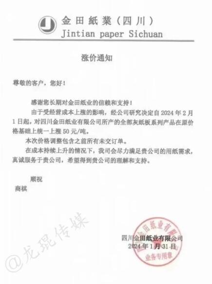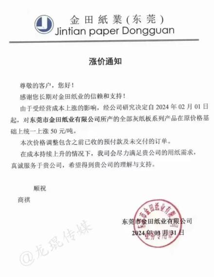 1月31日,金田紙業(yè)發(fā)布了最新的灰板紙漲價函。