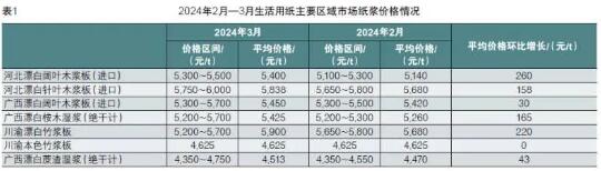 2024年3月紙漿價格變化情況具體如下,河北漂白闊葉木漿板(進口)平均價格上漲260元/t,為5400元/t。河北漂白針葉木漿板(進口)平均價格上漲158元/t,為5838元/t。廣西漂白闊葉木漿板(進口)平均價格上漲30元/t,為5450元/t。廣西本地漂白桉木濕漿(絕干計)平均價格上漲165元/t,為5425元/t。