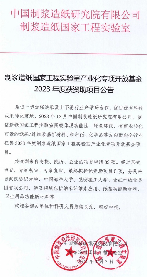 為進(jìn)一步加強(qiáng)造紙及上下游行業(yè)產(chǎn)學(xué)研合作,促進(jìn)優(yōu)秀科技成果轉(zhuǎn)化落地,中國(guó)制漿造紙研究院、制漿造紙國(guó)家工程實(shí)驗(yàn)室啟動(dòng)征集了2023年度制漿造紙國(guó)家工程實(shí)驗(yàn)室產(chǎn)業(yè)化專項(xiàng)開放基金項(xiàng)目,得到了行業(yè)相關(guān)機(jī)構(gòu)的大力支持,現(xiàn)對(duì)征集和最終評(píng)審情況予以公告。歡迎各相關(guān)單位和科研人員持續(xù)關(guān)注該基金后續(xù)征集活動(dòng),積極申報(bào)。
