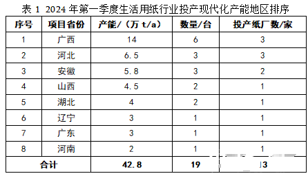根據生活用紙委員會秘書處調研匯總,2024年1—3月,行業新投產現代化產能約42.8萬t/a,共19臺紙機,其中,2臺進口紙機,17臺國產紙機,與2023年1—3月投產產能30.9萬t/a相比,產能增幅有所回升。