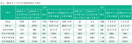 概述 1.國家統計局發布 2024年5月,在以習近平同志為核心的黨中央堅強領導下,各地區各部門認真貫徹落實黨中央、國務院決策部署,堅持穩中求進工作總基調,完整、準確、全面貫徹新發展理念,加快構建新發展格局,著力推動高質量發展,國民經濟延續回升向好態勢,生產穩定增長,需求持續恢復,就業物價總體穩定,國際收支平衡,轉型升級持續,運行總體平穩。 工業生產實現較快增長,裝備制造業和高技術制造業增勢良好。 2024年5月,全國規模以上工業增加值同比增長5.6%,環比增長0.3%。分門類看,制造業增長6.0%。其中,裝備制造業增加值增長7.5%,高技術制造業增加值增長10.0%,增速分別快于全部規模以上工業1.9%和4.4%。分經濟類型看,國有控股企業增加值增長3.6%,股份制企業增長6.4%,外商及港澳臺投資企業增長2.5%,私營企業增長5.9%。分產品看,3D打印設備、新能源汽車、集成電路產品產量同比分別增長36.3%、33.6%、17.3%。2024年1—5月,全國規模以上工業增加值同比增長6.2%。 2024年5月,制造業采購經理指數為49.5%,企業生產經營活動預期指數為54.3%。2024年1—4月,全國規模以上工業企業實現利潤總額20947億元,同比增長4.3%。 2.海關統計數據的總體狀況 貨物進出口實現較快增長,貿易結構繼續優化。 2024年5月,貨物進出口總額37077億元,同比增長8.6%。其中,出口21471億元,增長11.2%;進口15607億元,增長5.2%。進出口相抵,貿易順差5864億元。2024年1—5月,貨物進出口總額175042億元,增長6.3%。其中,出口99502億元,增長6.1%;進口75541億元,增長6.4%。2024年1—5月,一般貿易進出口增長5.6%,占進出口總額的比重為65.1%。民營企業進出口增長11.5%,占進出口總額的比重為54.7%,比上年同期提高2.6%。機電產品出口增長7.9%,占出口總額的比重為59.0%。 中國印刷及設備器材進出口數據 1.印刷設備 2024年1—5月印刷設備進出口數據如表1所示。