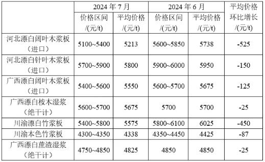 2024年7月紙漿價格變化情況具體如下,河北漂白闊葉木漿板(進口)平均價格下降525元/t,為5213元/t。河北漂白針葉木漿板(進口)平均價格下降150元/t,為5800元/t。廣西漂白闊葉木漿板(進口)平均價格下降125元/t,為5550元/t。廣西本地漂白桉木濕漿(絕干計)平均價格下降25元/t,為5675元/t。
