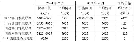 非木漿原紙中,川渝漂白竹漿原紙平均價格下降162元/t,為6813元/t。川渝本色竹漿原紙平均價格下降125元/t,為5900元/t。廣西漂白蔗渣漿原紙平均價格約6250元/t,與6月持平。