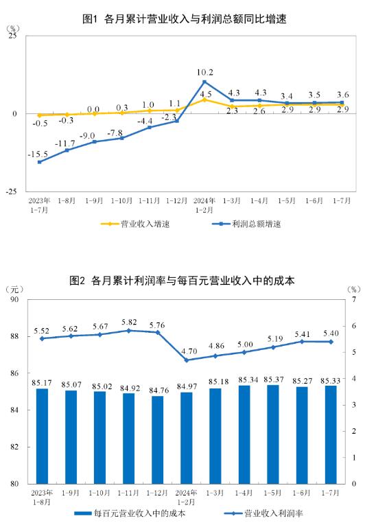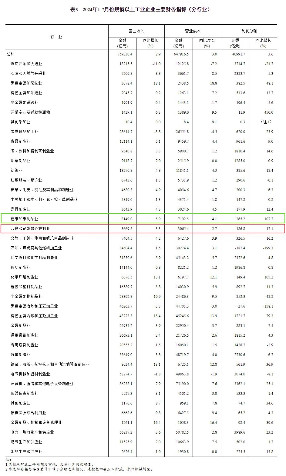 1—7月份,規模以上工業企業實現營業收入75.93萬億元,同比增長2.9%;發生營業成本64.79萬億元,增長3.0%;營業收入利潤率為5.40%,同比提高0.04個百分點。其中,造紙和紙制品業實現營業收入8149.0億元,同比增長5.9%;印刷和記錄媒介復制業實現營業收入3669.5億元,同比增長3.3%。 7月末,規模以上工業企業資產總計172.76萬億元,同比增長5.3%;負債合計99.51萬億元,增長5.1%;所有者權益合計73.25萬億元,增長5.7%;資產負債率為57.6%,同比下降0.1個百分點。 7月末,規模以上工業企業應收賬款25.10萬億元,同比增長8.1%;產成品存貨6.47萬億元,增長5.2%。 1—7月份,規模以上工業企業每百元營業收入中的成本為85.33元,同比增加0.09元;每百元營業收入中的費用為8.41元,同比持平。 7月末,規模以上工業企業每百元資產實現的營業收入為76.4元,同比減少2.3元;人均營業收入為179.4萬元,同比增加7.8萬元;產成品存貨周轉天數為20.4天,同比增加0.2天;應收賬款平均回收期為66.5天,同比增加3.4天。 7月份,規模以上工業企業實現利潤同比增長4.1%。 國家統計局工業司統計師于衛寧解讀工業企業利潤數據表示,7月份,隨著工業經濟高質量發展穩步推進,新動能持續培育壯大、工業生產保持穩定,工業企業利潤延續恢復態勢,工業企業效益狀況呈現以下主要特點:工業企業利潤增長有所加快;工業企業營收平穩增長;高技術制造業引領利潤增長;裝備制造業利潤穩定增長;消費品制造業利潤保持兩位數增長。總體看,規上工業企業效益延續平穩恢復態勢,但同時也要看到,國內消費需求依然偏弱,外部環境復雜多變,工業企業效益恢復基礎仍需繼續鞏固。